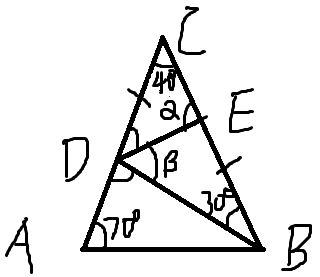 \frac {DE}{sin40°}=\frac{CD}{sinα}\ \ \ \ (2)