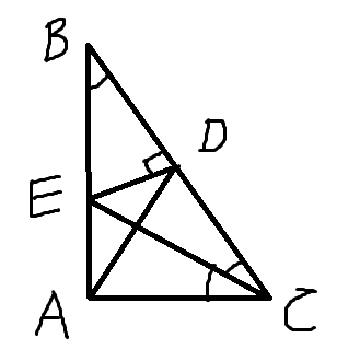 作$BC$的中点$D$,连接$DE$,则: $$ \begin{align} DE ⊥ AB\\ AC=&CD\\ \angle DCE=&\angle ACE\\ CE=&CE\\ =>\triangle ACE≌&\triangle DCE\\ =>\angle CAE=&\angle CDE\\ =>\angle CAE=&90° \end{align} $$ 即$\angle A=90°$得证。
