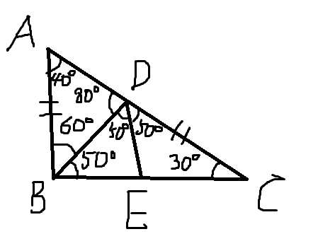 作$\angle BDC$的平分线交$BC$于$E$点,则: $$ \begin{align} \angle BCD=&30°\\ \angle CDE=&50°\\ \angle EDB=&50°\\ \angle DBE=&50°\\ \angle BDA=&80°\\ \angle BAD=&40° \end{align} $$ 在$\triangle ABD$中,由正弦定理得: $$ \frac {AB}{sin80°}=\frac{BD}{sin40°}\ \ \ \ (1) $$ 在$\triangle BCD$中,由正弦定理得: $$ \begin{align} \frac {BD}{sin30°}=&\frac{CD}{sin50°}\\ \ \ \ \ =>BD=&\frac{sin30°}{sin50°}\times CD\ \ \ \ (2) \end{align} $$ 将$(2)$代入$(1)$消去$BD$得: \begin{align} \frac {AB}{sin80°}=&\frac {sin30°}{sin40°\times sin50°}\times CD\\ => AB=&\frac{sin80°\times sin30°}{sin40°\times sin50°}\times CD\\ =&\frac{sin80°\times sin30°}{-\frac 12(cos90°-cos10°)}\times CD\\ =&\frac{sin80°\times sin30°}{\frac 12cos10°}\times CD\\ =&CD \end{align} 即$AB=CD$,原命题得证。