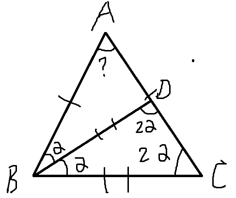 在$\triangle ABC$中,$AB=AC$,$BD$平分$\angle ABC$,交$AC$于点$D$,若$BD=BC$,求$\angle A=?$